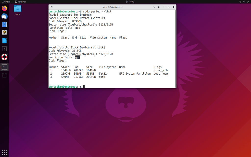 ၂ ။ Ubuntu terminal ကနေ ” sudo parted –list ” ဆိုပြီးကြည့်ပြီးတော့လည်း သိနိုင်ပါတယ်