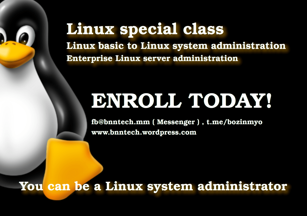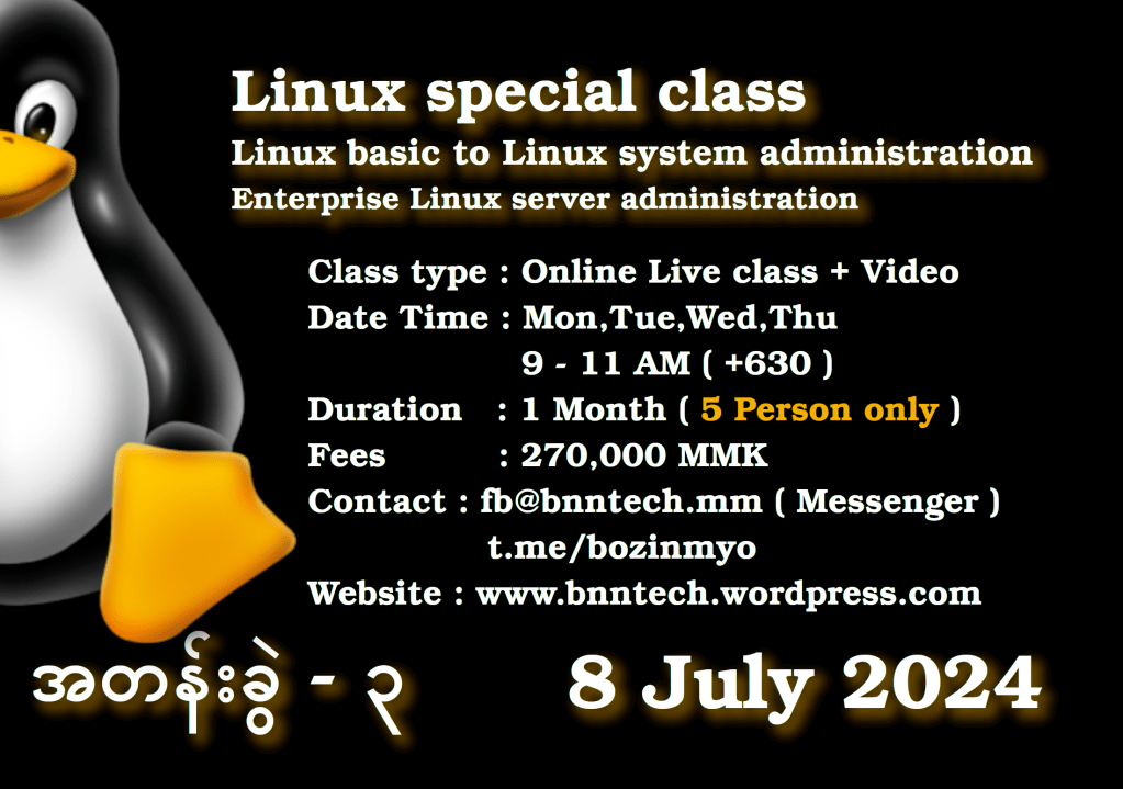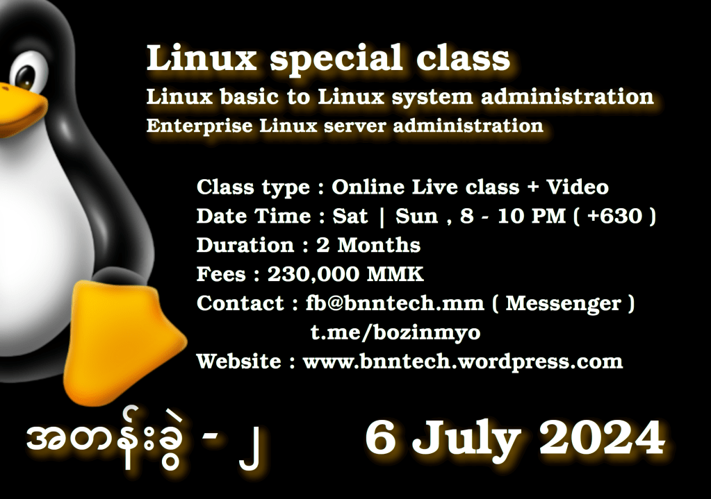 အထူးရည်ရွယ်ပြီး ဖွင့်ပေးထားတဲ့ Linux တစ်ခုတည်း သီးသန့်သင်ကြားပေးနေတဲ့ သင်တန်းပဲ ဖြစ်ပါတယ်။ Linux special class ကို ပြည်တွင်းသာမက ပြည်ပ မှာရှိတဲ့ စသည့် နိုင်ငံများမှ 🇹🇭🇲🇾🇰🇷🇯🇵🇸🇬🇦🇺🇮🇱🇦🇪🇶🇦မြန်မာ IT လူငယ် များလည်း တက်ရောက် သင်ယူနေကြတာဖြစ်ပါတယ် ။