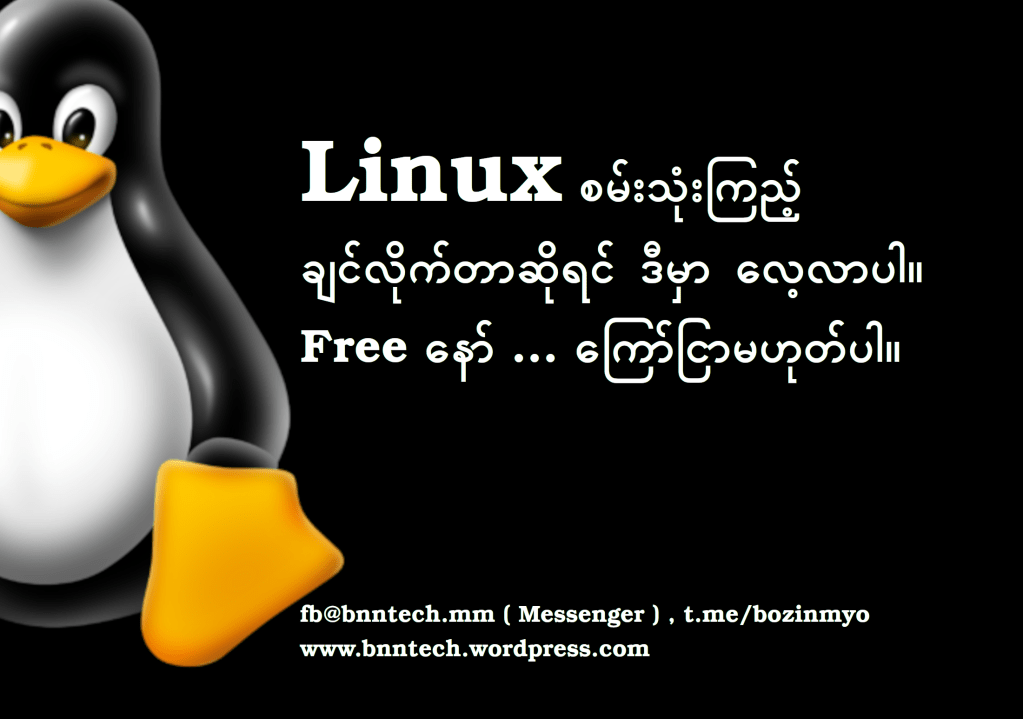 Linux ကို စိတ်ဝင်စား သွားပြီ ဆိုရင် Linux server တွေထိန်းချုပ် ချင်တယ် Linux system administration ကို ဆက်လေ့လာချင်တယ်ဆိုရင်တော့ ကျနော် ရဲ့ Linux special class မှာ Join ပြီးလေ့လာနိုင်ပါတယ် ။ ဒီ Class ဟာ သင်တန်းသား ၂၀၀ ကျော် လေ့လာပြီး ဖြစ်ပါတယ်။ ဒါ့ကြောင့် သင်တန်းရည်ရွယ်ချက်ရယ် Linux system administration ဆိုတာ ဘာလဲဆိုတာ သိနိုင်အောင် ဖော်ပြပါ Home ကို သွား၍ ဖြစ်စေ ဖော်ပြပါ Link တွေနှိပ်၍ ဖြစ်စေ လေ့လာနိုင်ပါတယ်။ Linux special class ကို အားလုံး အဆင်ပြေအောင် ရုံးချိန်လွတ်တွေပဲ လေ့လာရမှာပါ။ ကြိုက်နှစ်သက်ရာ တန်းခွဲတွေကို လစဥ် လေ့လာခွင့်ရမှာမို့ အခုပဲ လေ့လာကြည့်နော် ။ Linux သင်ဖို့ အခြေခံ လုံးဝ တက်ထားစရာမလိုပါ။