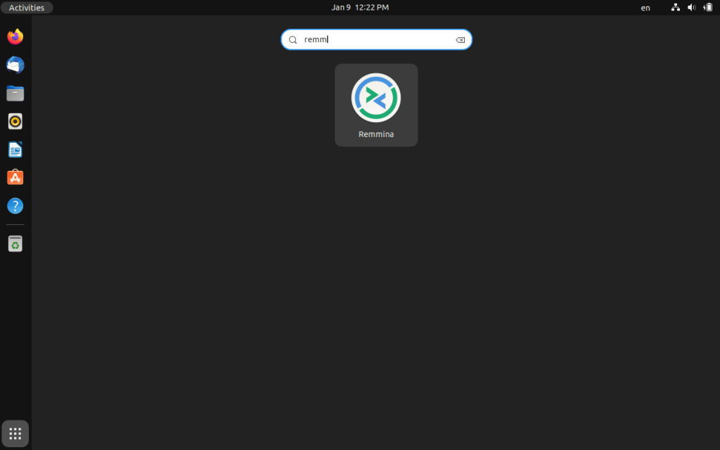 ဒါကတော့ Client side မှာရှိတဲ့ Ubuntu Computer က လုပ်ရမည့် အပိုင်းပါ။ဆိုတော့ Ubuntu ရဲ့ Software တွေထဲမှာ Remmina ဆိုတဲ့ Application ကို ဖွင့်လိုက်ပါ။ ဒီ Application က Ubuntu ကို installation လုပ်ကတည်းက ပါပြီးသားဖြစ်တာမို့ ထပ်ပြီး install လုပ်စရာမလိုပါဘူး။